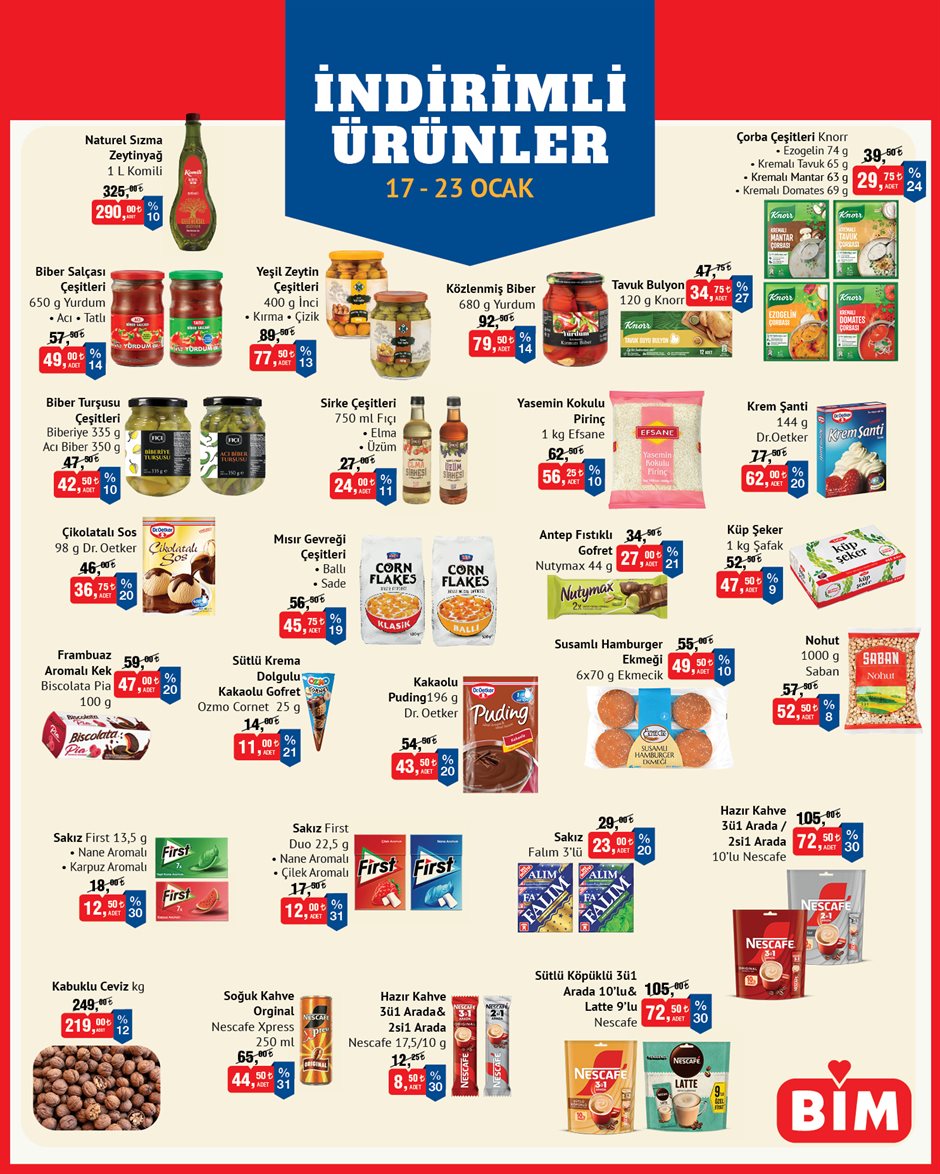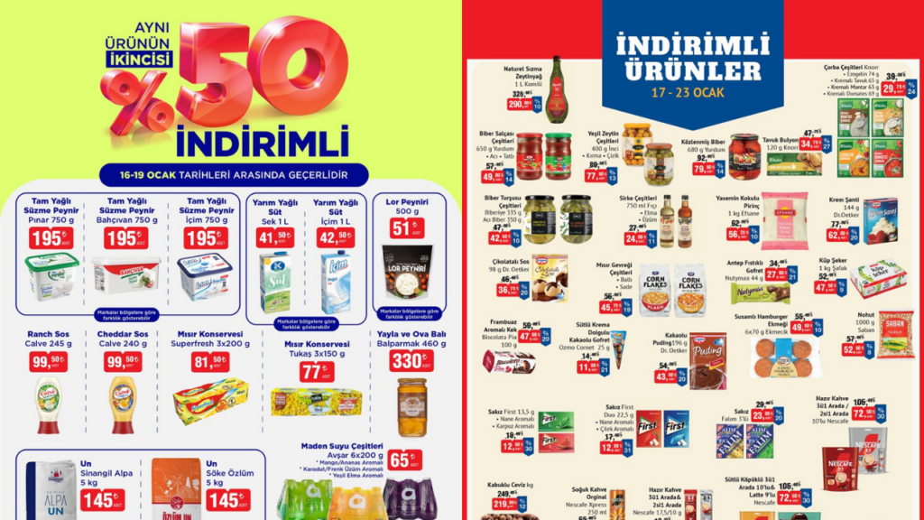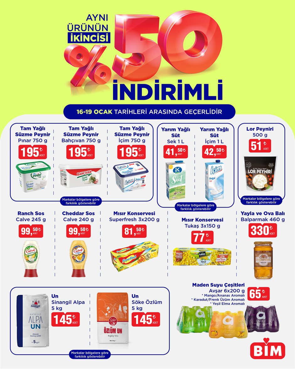 Bugüne özel ikinci üründe yüzde 50 indirim kampanyasının başladığını duyuran BİM, meyve ve sebzeye de bugüne özel indirim geldiğini ve 23 Ocak’a kadar makarna ve bakliyat çeşitleri başta olmak üzere diğer temel gıda ürünlerinin indirimli fiyatlarla raflardaki yerini alacağını duyurdu.