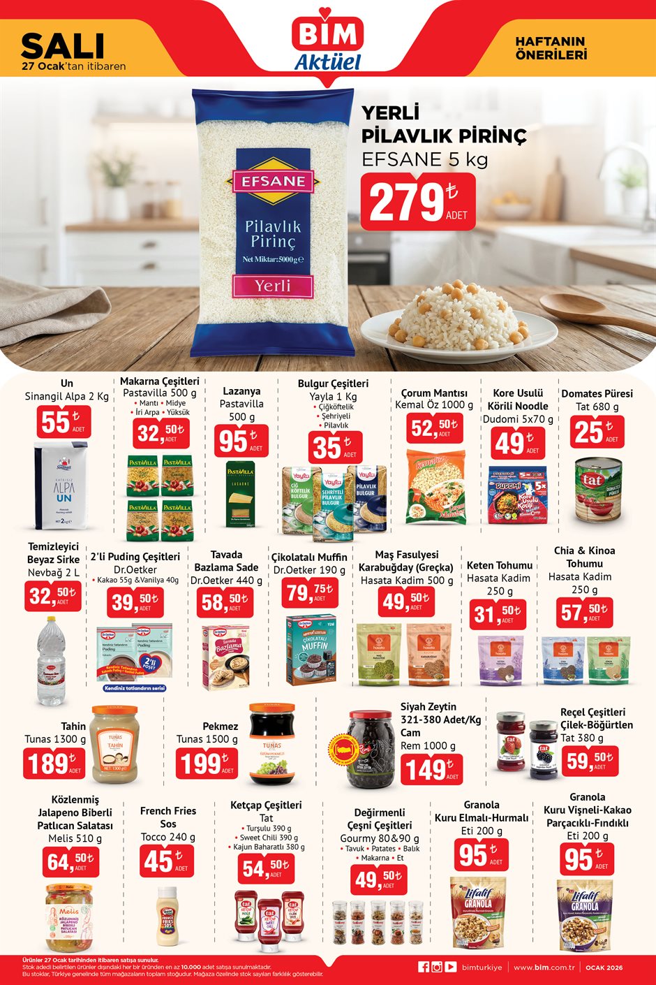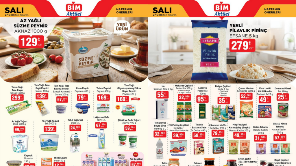 BİM, 27 Ocak tarihinden itibaren yeni indirim kampanyasını başlatacağını duyururken, bu indirim kampanyasına yönelik aktüel kataloğunu da tüketicileriyle paylaştı. Söz konusu kataloğu göre, süt ve süt ürünlerinden bakliyata, dondurulmuş gıdalardan atıştırmalıklara kadar pek çok farklı kategorideki ürünün indirimli olarak satışa sunulacak.